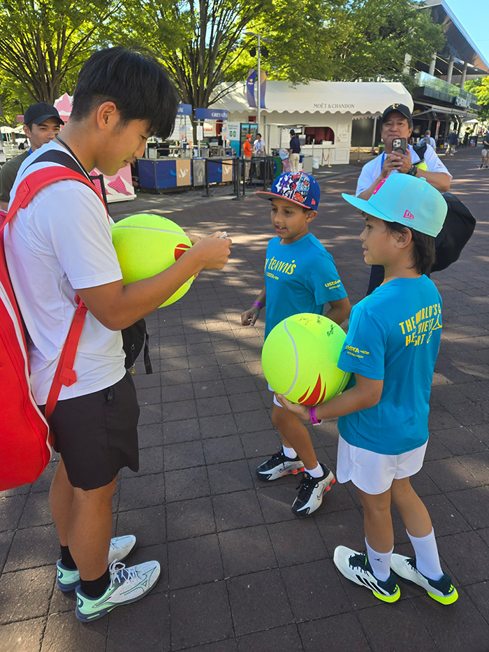 朝はUSオープン会場で初めてヒッティングができ、来年はこの場で試合をしたいと強く思いました。明日も会場で練習し、プロの試合を観て少しでも学びを吸収したいです。