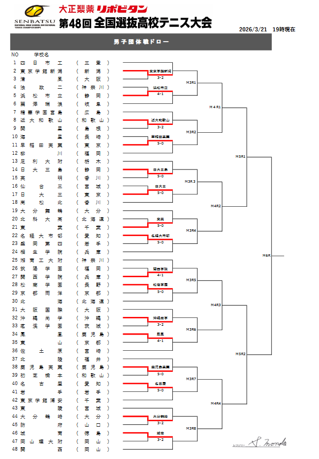 ◆ 第48回全国選抜高校テニス大会 男子団体第1日目結果(詳細はこちら)