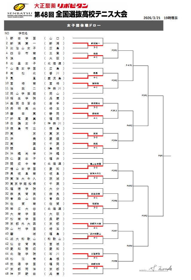 ◆ 第48回全国選抜高校テニス大会 女子団体1日目結果(詳細はこちら)