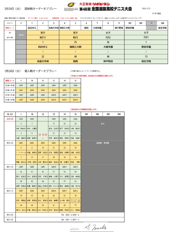 【出場校の皆様へ】3月23日(第3日目)の団体戦オーダーオブプレー発表