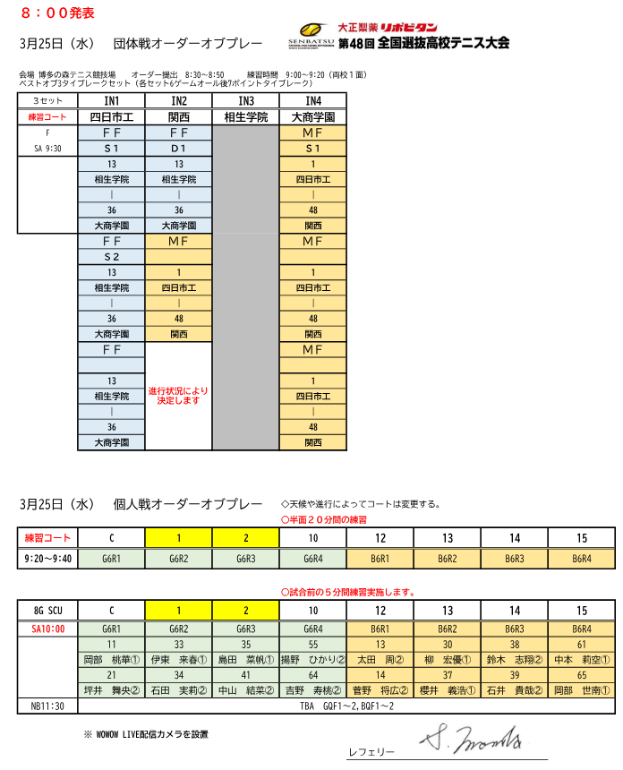 【出場校の皆様へ】3月23日の個人戦オーダーオブプレー発表